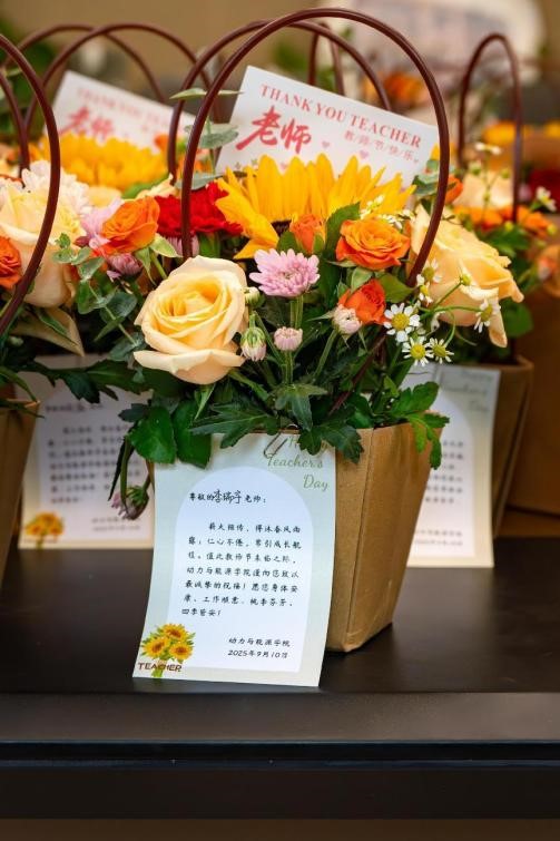 手写贺卡上,一笔一划皆是真挚,字里行间满溢着对师者的崇敬与祝福;盛放的鲜花旁,笑意盈盈格外动人,芬芳映照着老师们眼中的欣慰与温柔;专属定制的礼物里,每一处细节都藏着用心,凝聚着学院对每位教师的深切致谢。